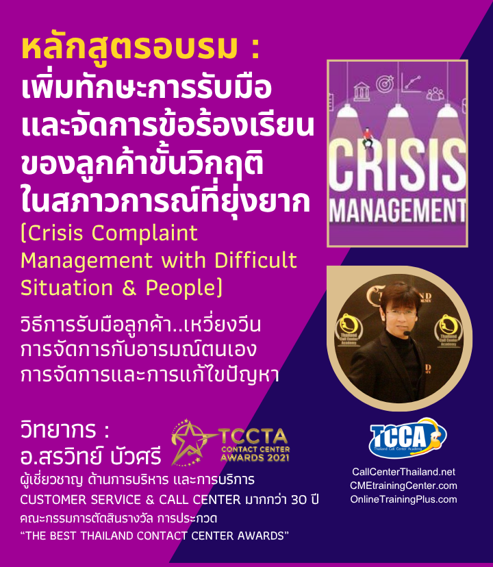 ตัวอย่างการอบรมหลักสูครทักษะการรับมือและจัดการข้อร้องเรียนของลูกค้าที่ผ่านมา : หลักสูตร : เทคนิคการสื่อสารประสานงานและการรับเรื่องร้องเรียนของลูกค้าขั้นวิกฤติ ในสภาวการณ์ที่ยุ่งยาก (Communication Technique & Crisis Complaint Handling with Difficult Situation & People) Link: https://onlinetrainingplus.com/ Link: https://www.callcenterthailand.net/home/ Link: https://www.cmetrainingcenter.com/