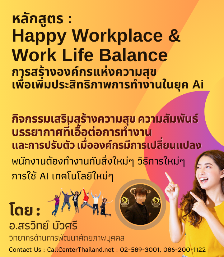 ตัวอย่างการอบรมหลักสูตร Happy Workplace ที่ผ่านมา : SC-04 : หลักสูตร Happy Workplace & Work Life Balance (หลักสูตรอบรมการสร้างความสุขในสถานที่ทำงาน และการทำงานให้มีความสุข) เพื่อสร้าง EQ ให้เป็นองค์กรแห่งความสุข 8 ประการ (callcenterthailand.net)
