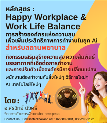 หลักสูตรสำหรับสถานพยาบาล : การสร้างองค์กรแห่งความสุข เน้นกิจกรรมการสื่อสาร เพื่อสร้างความสัมพันธ์ และบรรยากาศที่เอื้อต่อการทำงาน ขจัดความขัดแย้ง ปรับ Mindset และปรับตัวให้ยอมรับการเปลี่ยนแปลง เมื่อพนักงานต้องทำงานร่วมกับ Ai และ เทคโนโลยีใหมๆในสถานพยาบาล