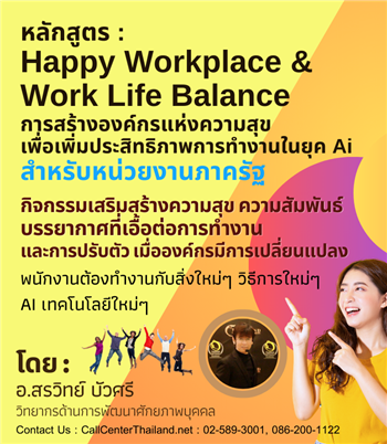 หลักสูตรสำหรับหน่วยงานภาครัฐ : การสร้างองค์กรแห่งความสุข เน้นกิจกรรมการสื่อสาร เพื่อสร้างความสัมพันธ์ และบรรยากาศที่เอื้อต่อการทำงาน ขจัดความขัดแย้ง ปรับ Mindset และปรับตัวให้ยอมรับการเปลี่ยนแปลง เมื่อพนักงานต้องทำงานร่วมกับ Ai และ เทคโนโลยีใหมๆในหน่วยงาน