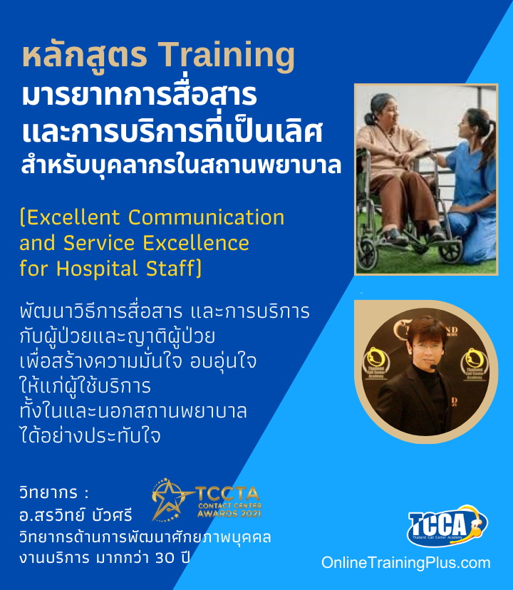 หลักสูตร How to นี้จึงได้ออกแบบมาเพื่อให้เจ้าหน้าที่ในโรงพยาบาลทุกคน ทุกตำแหน่ง ได้พัฒนาปรับปรุงทัศนคติ Service Mind การดูแล วิธีการสื่อสารกับผู้ป่วยและญาติผู้ป่วย อย่างละเอียด Sensitive ทั้งในและนอกสถานที่สถานพยาบาล เช่น ภายในโรงพยาบาล ศูนย์ดูแลผู้ป่วย-บ้านของผู้ป่วย..เพื่อสร้างความประทับใจแก่ผู้ใช้บริการจากโรงพยาบาล ได้อย่างเป็นเลิศ จนเกิดการบอกต่อ วิทยากร : อ.ต้น สรวิทย์ บัวศรี : วิทยากร ผู้เชี่ยวชาญ และที่ปรึกษาด้านงานบริการ Service Mind & Service Communication ประสบการณ์ด้านการพัฒนาการบริการในสถานพยาบาล เวชกรรม มากกว่า 250 แห่งทั่วประเทศ อาทิ : โรงพยาบาลกรุงเทพ โรงพยาบาลบํารุงราษฎร์ โรงพยาบาลพญาไท ศูนย์พยาบาลนอกโรงพยาบาล วุฒิศักดิ์คลินิก พฤกษาคลินิก รมย์รวินท์คลินิก Amara Clinic Chanisa Clinic ผู้ก่อตั้ง อดีตนายกสมาคมการค้าธุรกิจศูนย์บริการทางโทรศัพท์ไทย (TCCTA) (2015-2017) คณะกรรมการพิจารณาประเมินผลและตัดสินรางวัล Thailand Contact Center Award (2012-2026) สนใจอบรม inhouse Training ติดต่อได้ที่ : คุณไก่ : หมายเลขโทรศัพท์ : 02-589-3001 , 086-200-1122 E-mail : info@callcenterthailand.net