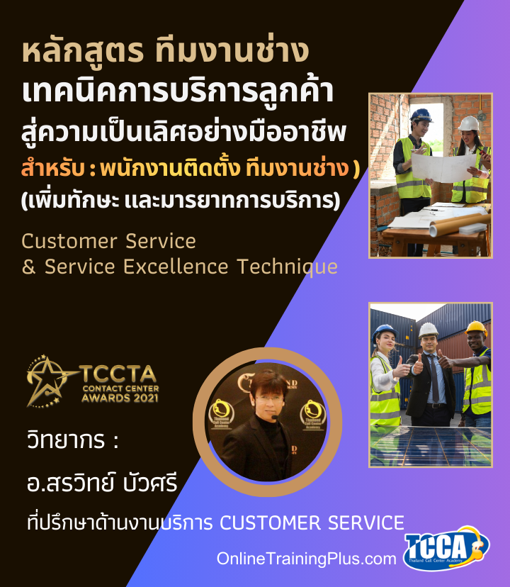 หลักสูตรการฝึกอบรม เทคนิคการบริการลูกค้า..สู่ความเป็นเลิศ อย่างมืออาชีพ หัวข้อ “เพิ่มทักษะและมารยาท สำหรับพนักงานติดตั้ง ทีมงานช่าง ทั้งทางโทรศัพท์ และแบบ Face to Face” (Customer Service Excellence Technique) หลักสูตรสำหรับพนักงานติดตั้ง ทีมงานช่าง เพื่อยกระดับการบริการสู่ระดับที่เป็นเลิศ โดยกระตุ้นการปฏิบัติงานในเรื่องการติดตั้ง ดูแลลูกค้า การรับเรื่อง การประสานงาน การส่งมอบ และการทำงานร่วมกันเป็น Teamwork ได้อย่างมีประสิทธิภาพ รวมถึงการสร้างความรัก ความอบอุ่น ความสุข ทุ่มเทใจในการทำงาน เห็นคุณค่าในงานที่ทำ ทำให้พนักงานมีความกระตือรือร้น และพัฒนาการปฏิบัติหน้าที่ให้มีประสิทธิภาพดียิ่งขึ้น ทั้งในการปฏิบัติงานและชีวิตประจำวัน พร้อมจุดพลังในการบริการแบบสร้างสรรค์ได้อย่างเป็นเลิศ