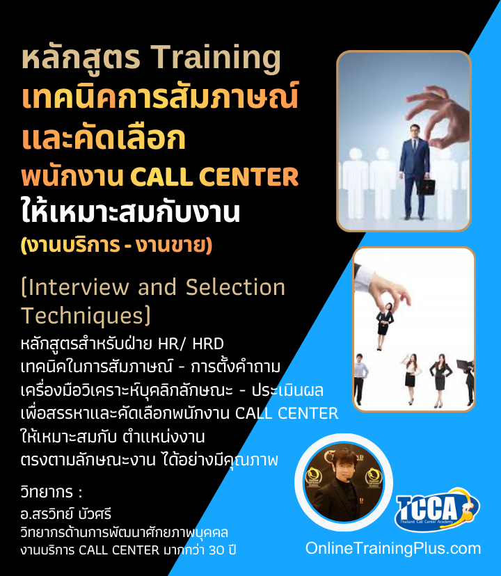 • วิทยากร : อ.ต้น สรวิทย์ บัวศรี - ผู้อำนวยการสถาบัน Thailand Call Center Academy • ระยะเวลาอบรม : 1 วัน (9.00-16.30 น.) • รูปแบบการอบรม : อบรมได้ทั้งแบบ Onsite Training และ Online Training ผ่าน “Zoom” • จำนวนผู้เข้าอบรม ที่มีประสิทธิผลสูงสุด : ไม่เกิน 15 ท่าน ต่อ 1 รุ่น • Special Class : ท่านสามารถติดต่อเจ้าหน้าที่ เพื่อกำหนดวันอบรม ในวันที่ท่านสะดวก ส่วนที่ 1 : กระบวนการสรรหา สัมภาษณ์ และคัดเลือกบุคลากร Call Center - ปัจจัยแห่งความสำเร็จในการบริหารงาน Call Center - โครงสร้างการบริหารงาน Call Center ที่เหมาะสม (Call Center Organization) - การกำหนดบทบาทและความรับผิดชอบของเจ้าหน้าที่ Call Center - การกำหนดคุณสมบัติพนักงาน Call Center - Inbound & Outbound - Information Service - Complaint Handling - Telesales - Technician & Helpdesk - Social Media Admin - Call Center Competency - การสรรหา สัมภาษณ์ และคัดเลือกบุคลากรให้เหมาะสมกับตำแหน่งงาน - วิธีการสรรหาและเทคนิคการคัดเลือกบุคลากร จากช่องทางต่างๆ - เทคนิคการสัมภาษณ์งานเชิงพฤติกรรมแบบทดลองงาน
