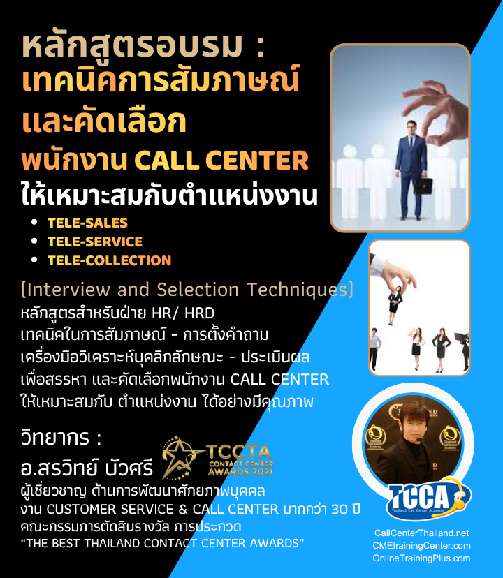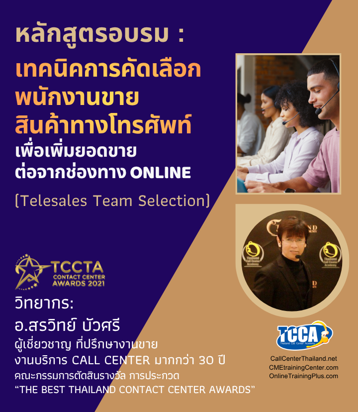 วิทยากร : อ.ต้น สรวิทย์ บัวศรี : วิทยากร ผู้เชี่ยวชาญ และที่ปรึกษาด้าน Telesales & Call Center โดยตรง ประสบการณ์ด้าน Call Center มากกว่า 30 ปี ผู้ก่อตั้ง อดีตนายกสมาคมการค้าธุรกิจศูนย์บริการทางโทรศัพท์ไทย (TCCTA) (2015-2017) คณะกรรมการพิจารณาประเมินผลและตัดสินรางวัล Thailand Contact Center Award (2012-2026) สนใจอบรมติดต่อได้ที่ : คุณไก่ หมายเลขโทรศัพท์ : 02-589-3001 , 086-200-1122 E-mail : info@callcenterthailand.net