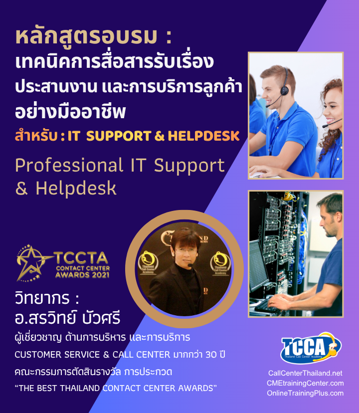 วิทยากร : อ.ต้น สรวิทย์ บัวศรี : วิทยากร ผู้เชี่ยวชาญ และที่ปรึกษาด้าน Telesales & Call Center โดยตรง ประสบการณ์ด้าน Call Center มากกว่า 30 ปี ผู้ก่อตั้ง อดีตนายกสมาคมการค้าธุรกิจศูนย์บริการทางโทรศัพท์ไทย (TCCTA) (2015-2017) คณะกรรมการพิจารณาประเมินผลและตัดสินรางวัล Thailand Contact Center Award (2012-2026) สนใจอบรมติดต่อได้ที่ : คุณไก่ : หมายเลขโทรศัพท์ : 02-589-3001 , 086-200-1122 E-mail : info@callcenterthailand.net