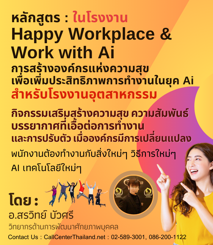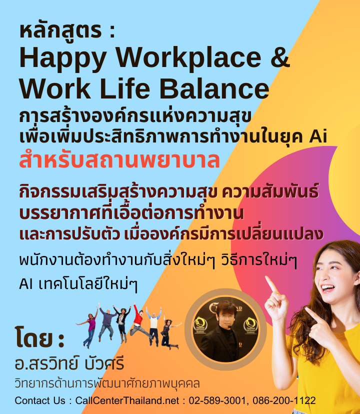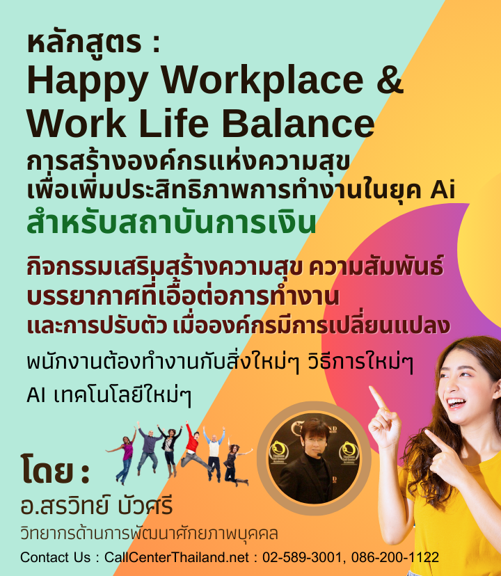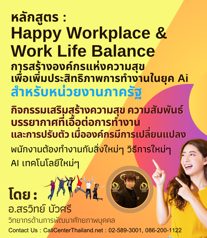 ตัวอย่างการอบรมหลักสูตร Happy Workplace ที่ผ่านมา : SC-04 : หลักสูตร Happy Workplace & Work Life Balance (หลักสูตรอบรมการสร้างความสุขในสถานที่ทำงาน และการทำงานให้มีความสุข) เพื่อสร้าง EQ ให้เป็นองค์กรแห่งความสุข 8 ประการ (callcenterthailand.net)